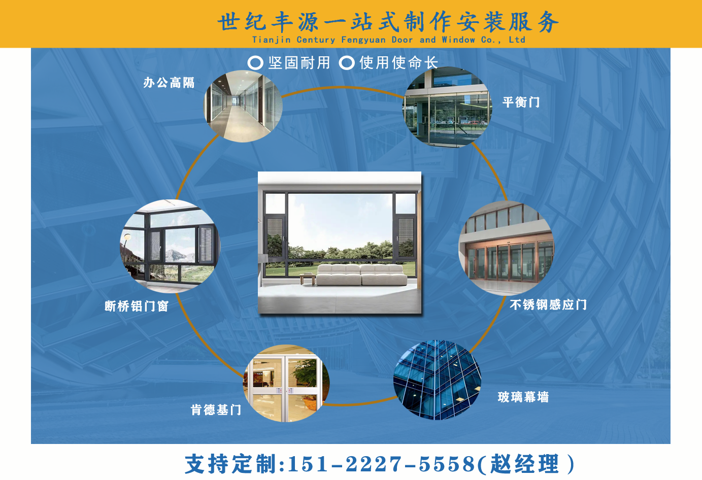 天津世紀(jì)豐源門窗有限公司從事斷橋鋁門窗,玻璃幕墻,平衡門,肯德基門,不銹鋼感應(yīng)門,百葉窗,辦公高隔,制作安裝一站式訂制生產(chǎn)及配套服務(wù)等?! 」咀猿闪⒁詠?,始終堅持以人才為本、誠信立業(yè)的經(jīng)營原則,薈萃業(yè)界精英,成熟的技術(shù)、管理方法及企業(yè)經(jīng)驗(yàn)與國內(nèi)企業(yè)的具體實(shí)際相結(jié)合,為企業(yè)供給各個方面的解決方案,使企業(yè)在激烈的市場競爭中始終堅持競爭力,實(shí)現(xiàn)企業(yè)快速、穩(wěn)定地發(fā)展。 質(zhì)量好、服務(wù)好、才能信譽(yù)好,公司已在諸多領(lǐng)域取得輝煌成績,愿意成為您可信賴的長期合作伙伴?! ∽屛覀償y手同行,共同實(shí)現(xiàn)“讓普通老百姓都用得上高端門窗”...